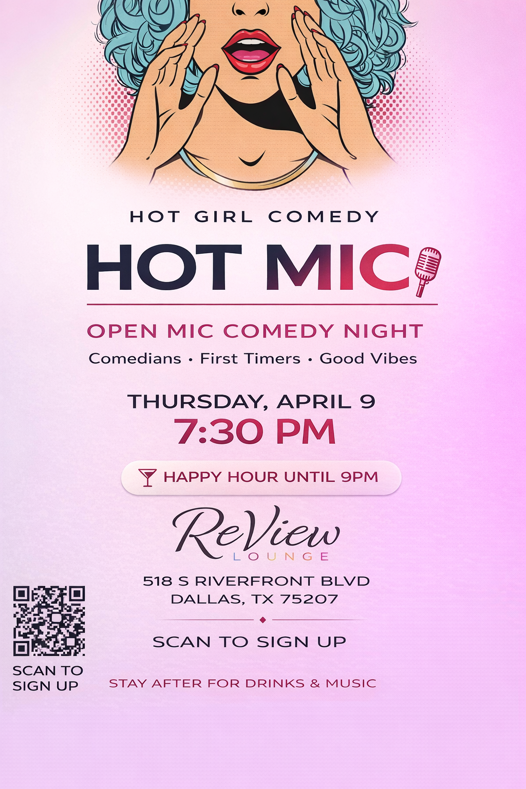 Open Mic Comedy Thursday, April 9, 2026 7:30 PM 10:00 PM ReView Lounge Dallas 518 South Riverfront Boulevard Dallas, TX, 75207 United States (map) Google Calendar ICS